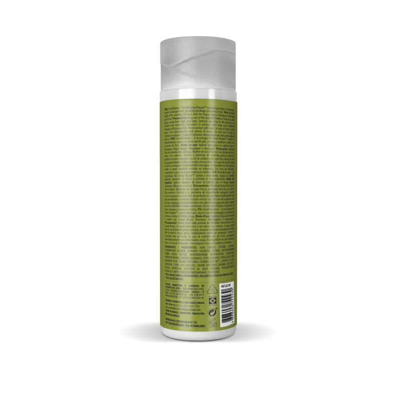 Conditioner Vegan repair, sa technologie Oil Green Repair facilite le démêlage, répare les cheveux abîmés, prévient la casse et aide à contrôler les frisottis. Ce conditioner est certifié Vegan, approuvé par l'association PETA, son emballage provient à 100% de produits recyclés et sa composition est à 97% d'origine naturelle.