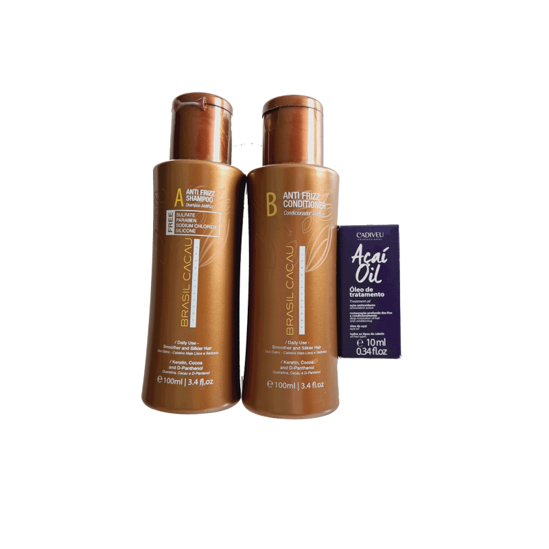 Ce kit comprend 1x Anti-Frizz Shampoo sulfate free 100ml + 1x Anti-Frizz Conditioner 100ml + 1x Acai Oil 10ml OFFERT
